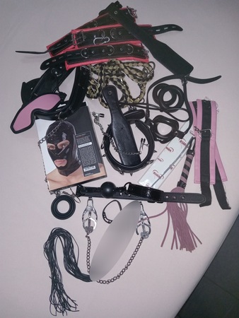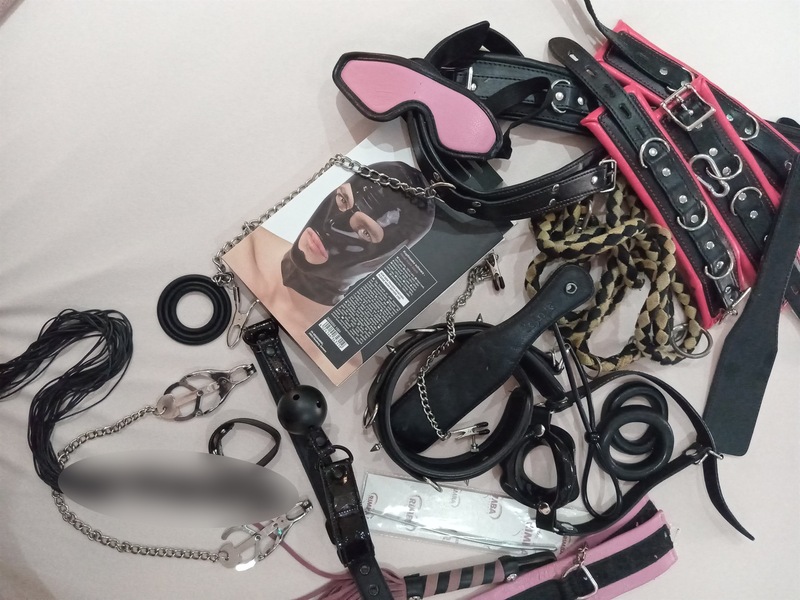 Str*p-*n, An*lkette, Plugs, Glasd*ld*, Nippelklemmen, Fl*gger/Pa**el, Latexmaske (für dich), Kn*b*l, Ball, M*ulsp*rr*, Fes***, Sp*nkin* (bei dir)